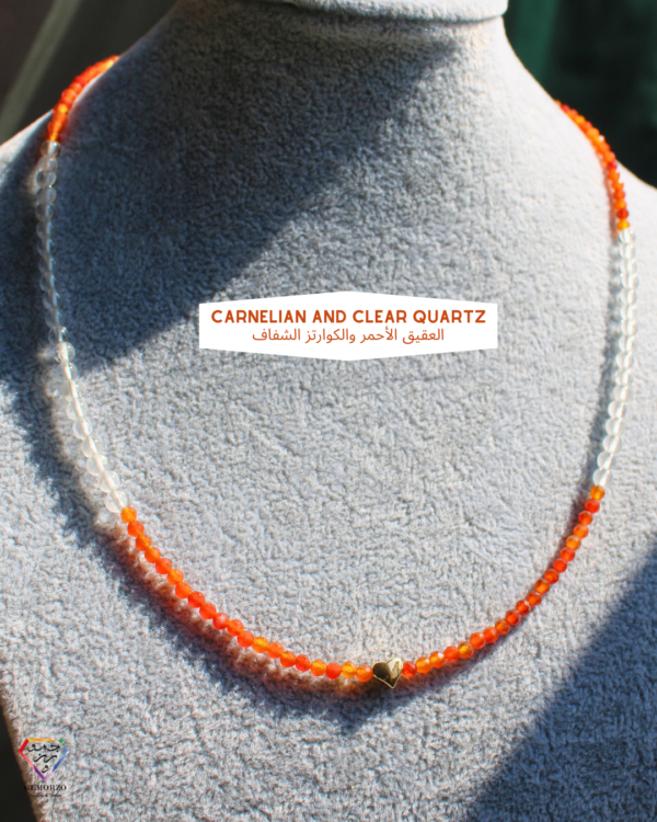 Necklace with Gold Plated Flower Charm – Handmade Carnelian and Clear Quartz Natural Stone Choker Necklace